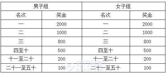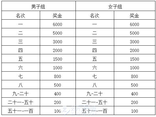 半程马拉松男、女第1至第100名运动员分获奖金见下表:
