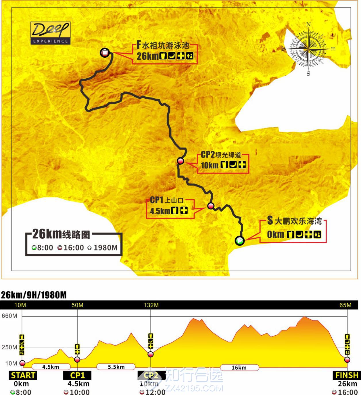 起点 → 龙头石 → 鹏程村 → 大鹏坳——上山口(CP1) → 火烧天 → 葵涌坳 → 坝光绿道(CP2) → 绝望坡 → 田心山 → 白老石 → 水祖坑 → 终点,合计约26公里,爬升约2000米
