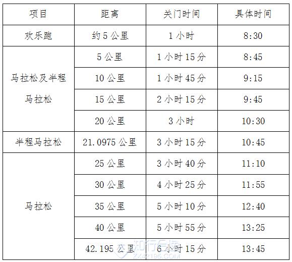 为了保证参赛选手比赛安全、顺利,将限时对道路交通进行封闭。比赛期间各比赛路段设关门时间,到了关门时间,相应公里点的计时地毯停止工作,各路段恢复正常交通。参赛选手在规定的关门时间内,未跑完对应的距离者应立即停止比赛,退出赛道,以免发生危险。退出的参赛选手可乘坐组委会提供的收容车到相应项目的终点处。各项目关门时间见下表:(7:30鸣枪时间为准)
