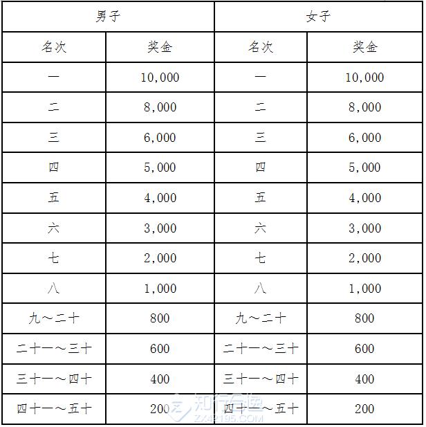 1、马拉松组第一至第五十名选手分别获得如下表所列的奖金。