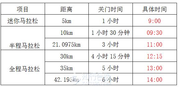 为了保证参赛运动员比赛安全、顺利,比赛期间比赛路线各段设关门时间,限时对交通封闭。起跑至关门时间到后,各路段恢复社会交通。参赛者在规定的关门时间内未跑完对应距离的参赛者须立即停止比赛,退出赛道,以免发生危险。退出比赛者可乘坐组委会提供的援助车到相应项目的终点。