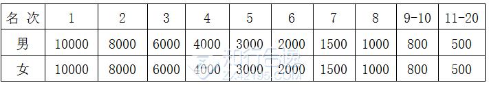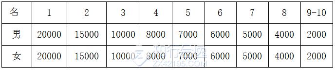 1. 半程马拉松组:按净计时成绩分别录取男、女前20名,分别获得奖金(见表,单位:人民币/元)
