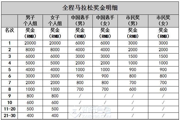 ①个人名次奖(共计118800元单位:人民币元):根据枪声计时成绩录取男女前30名运动员,并获得奖金,前三名现场颁奖。