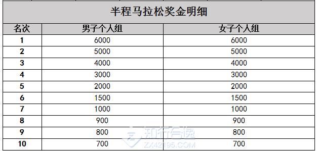 ②中国选手奖(共计36800元单位:人民币元):根据净计时成绩录取男、女前8名运动员,并获得奖金。与马拉松同时比赛,同时获得个人名次奖,取两者额度高的奖励,不累加。