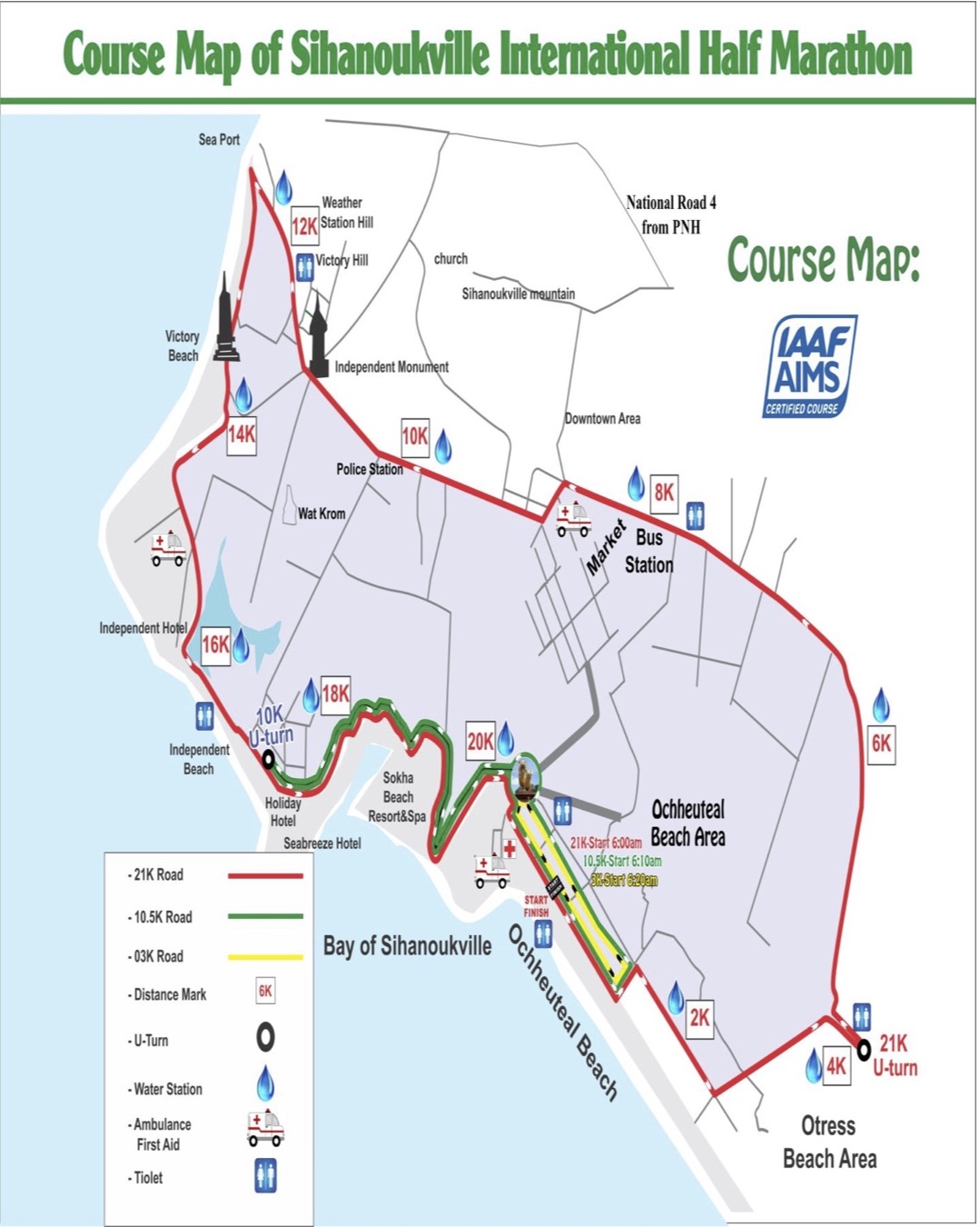 西哈努克国际半程马拉松赛道是这座城市的精华路线,赛道涵盖了城市最负盛名的五座海滩,最受褒奖的奥彻迭海滩,美不可言的搜哈海滩,尚未开发的欧特斯海滩,朴实舒适的独立海滩,静谧悠闲的胜利海滩......