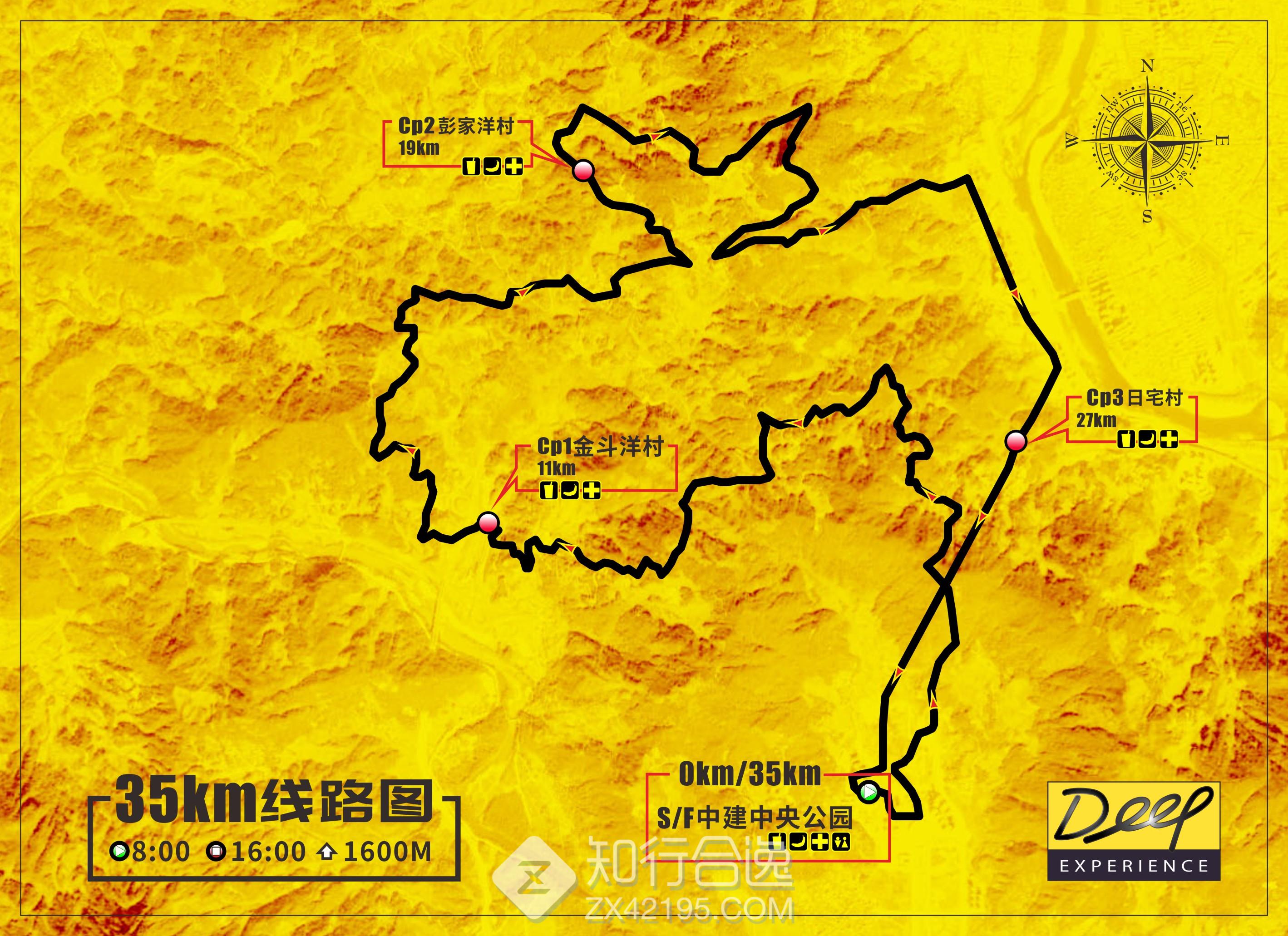35km组比赛起终点设在福安市溪北洋中建中央公园,全程约35公里,线路总爬升约1600米,赛道为硬化路面、山地、机耕道、丛林等地貌,赛道沿途共设3个补给站及检查打卡点。