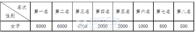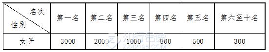 根据枪声计时成绩录取女子第一名至第五十名运动员现场颁发获奖证书,前八名并分别获得奖金(单位:人民币元),前三名另外颁发奖杯一座、完赛奖牌一枚、领奖服装一套。