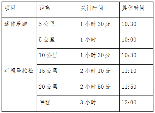 为保证参赛选手比赛安全,限时对社会交通封闭,比赛期间比赛路线各段设关门时间。关门时间过后,相应路段恢复社会交通。在规定的关门时间内,未跑完对应距离的参赛选手须立即停止比赛,退出赛道,以免发生危险。退出比赛的选手可乘坐组委会提供的收容车到相应项目的终点处。关门时间按自然时间计算,具体见下表:
