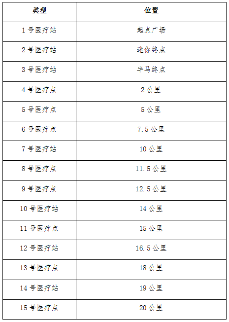 ①组委会在起点、沿途及终点设立固定医疗点;现场医务人员有权根据选手身体状况中止选手比赛并收取其号码布,如参赛选手不听从医护人员建议,坚持参赛而产生的一切后果及责任由参赛选手本人承担。医疗站点分布如下: