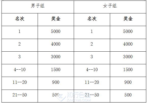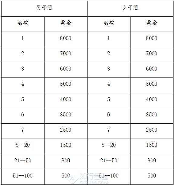 半程马拉松男、女第1至第100名运动员分别获得奖金见下表: