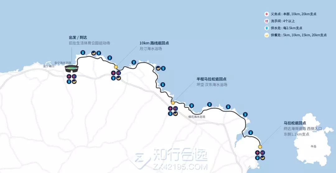 旧左生活体育公园运动场(金宁海水浴场)→月汀海水浴场(10km返回点) →坪垈汉东海水浴场(半程返回点)→细花海水浴场→下道海水浴场→终达海岸道西侧入口 东侧1.1km支点(全程返回点)