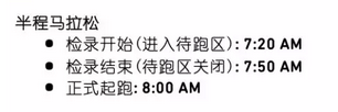 半程马拉松待跑区会根据预计完赛时间标记出不同区域。请跑者自觉根据自己的预计完赛时间选择相应区域出发。预计完赛时间短的跑者将会更靠近起跑线,预计时间长的跑者和新手跑者将在相对靠后的位置起跑。