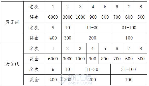 男/女前3名按枪声计时成绩录取,第4名开始按净计时有效成绩录取,并分别获得现金奖励见下表。(人民币,单位:元)
