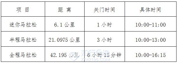 为了保证参赛者比赛安全、顺利,比赛期间比赛路线各段设关门时间,限时对交通封闭。起跑至关门时间到后,各路段恢复社会交通。在规定的关门时间后,未跑完竞赛项目对应距离者须立即停止比赛,按组委会指定的路线撤离赛道,以免发生危险。退出比赛者可乘坐组委会提供的摆渡车到相应项目的终点处。