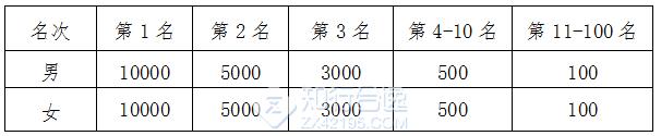 (二)半程马拉松组:分别录取男女前50名,前三名各颁发奖杯一座;前50名分别获得奖金,见下表(单位:人民币/元)。
