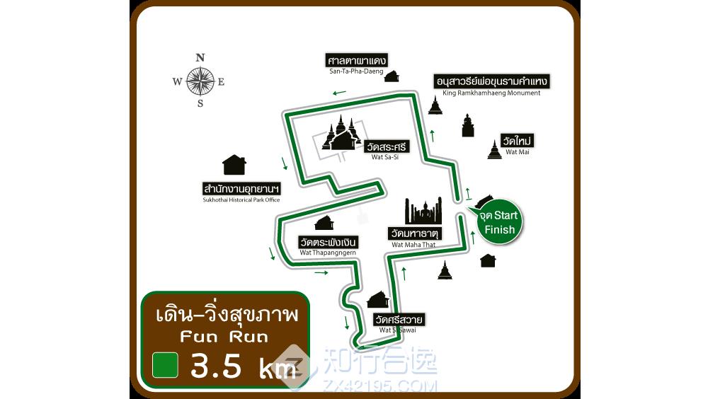 起点位于素可泰历史遗迹公园,沿途可见到世界遗产级别的建筑艺术古迹,会穿越数百上千年的茂密森林里。赛道是平坦的柏油路和清幽的古迹群森林小路,没有爬坡。