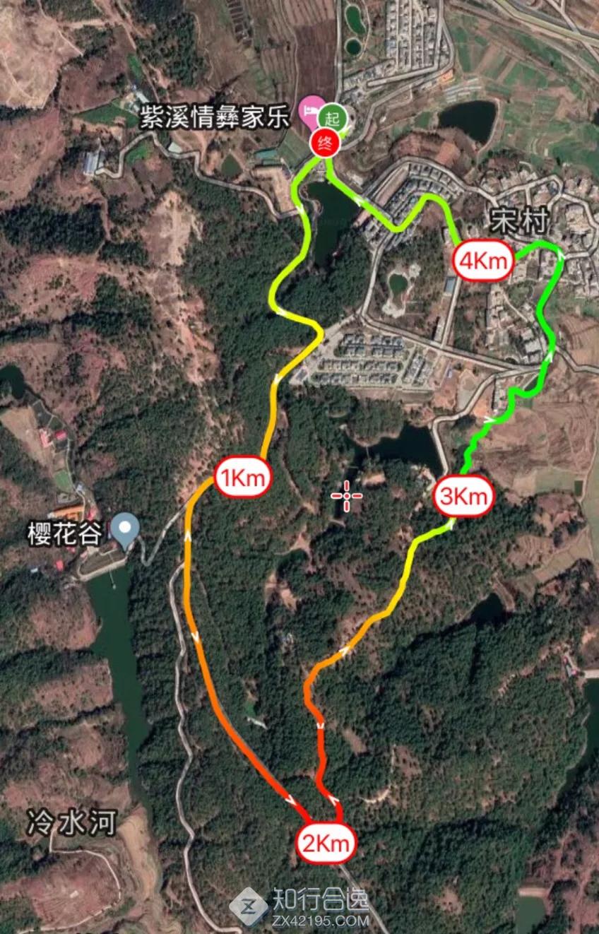 五公里体验组:紫溪山火把广场(起点)→樱花谷→松树林→宋村→紫溪山火把广场(终点)