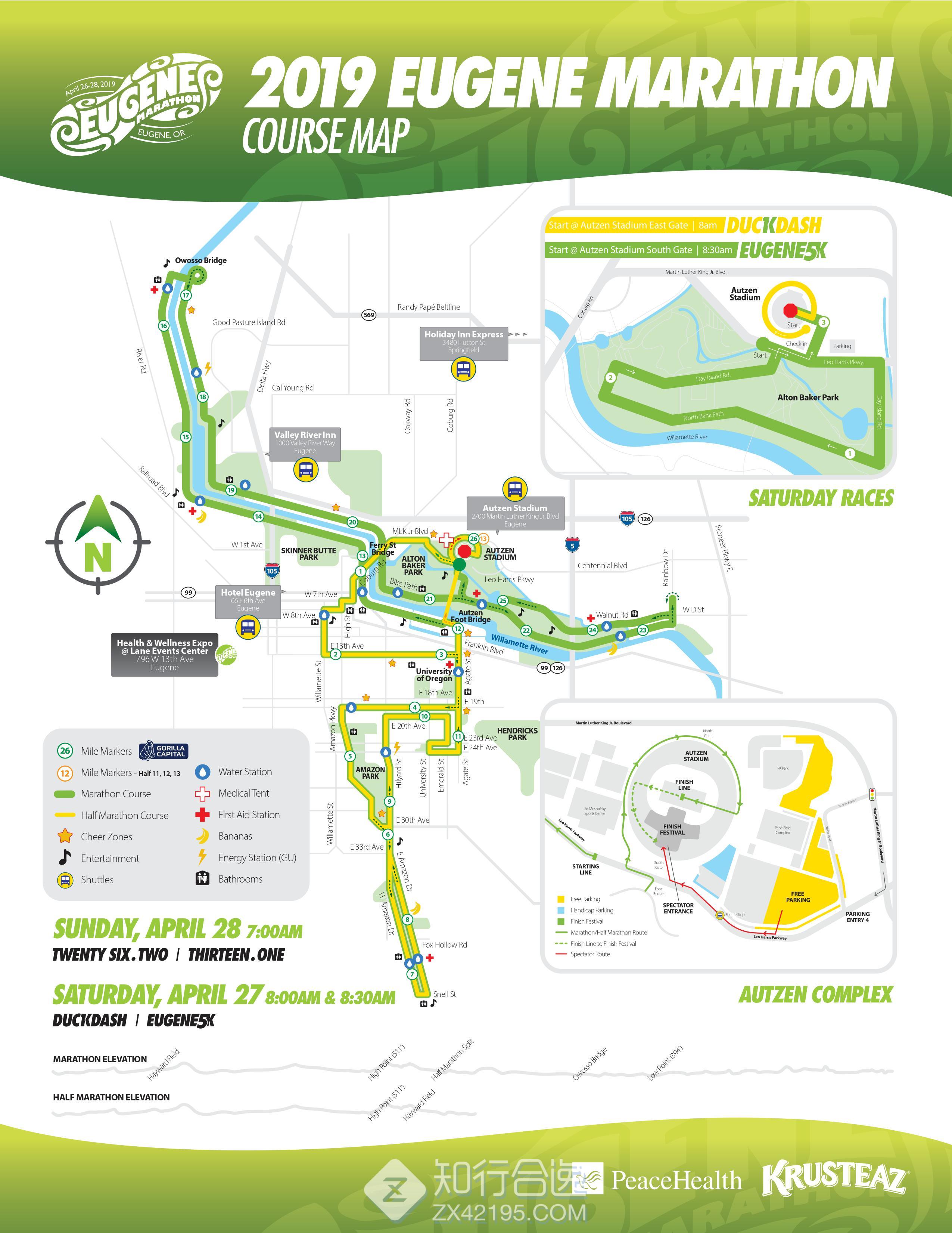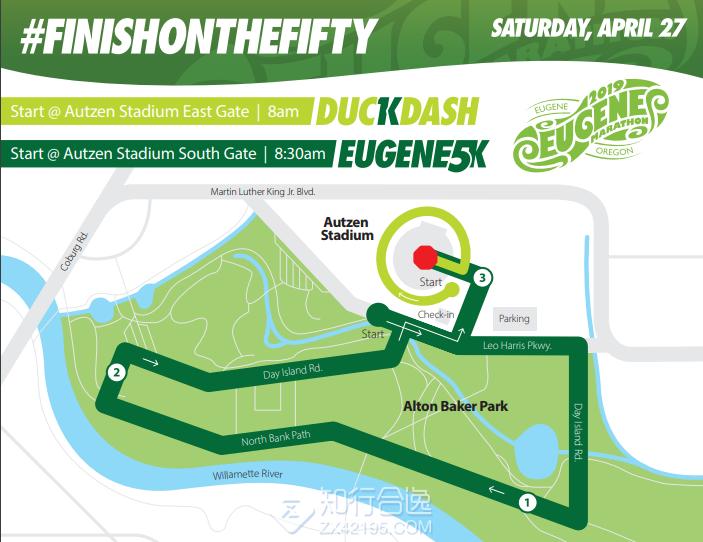 全马和半马起点在Leo Harris Parkway outside of Autzen Stadium, 5公里起点为on Leo Harris Parkway,终点Autzen Stadium