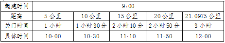 为了保证参赛选手比赛安全、顺利,比赛期间比赛路线各段设关门时间,限时对社会交通封闭。关门时间后,相应路段恢复社会交通。参赛选手未在规定的关门时间跑完对应的距离请立即停止比赛,退出赛道,以免发生危险。退出比赛的参赛选手可乘坐组委会提供的收容车到相应项目的终点处。