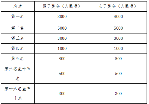 组委会为各年龄段中国籍参赛选手设置名次奖金,分别获得奖金200元人民币。根据净计时成绩分别录取各年龄段男、女第1至第10名选手,各年龄组名次奖获得者将于比赛后三日内通过官网公布,如无疑义,所获奖金汇入参赛选手的预留银行卡。