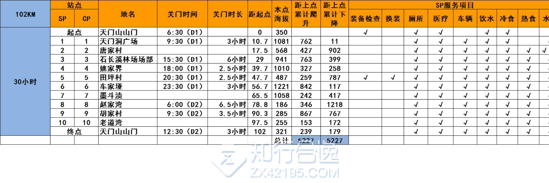 天门山山门——通天曲道(九十九道拐)——天门洞广场(SP1/CP1点)——上天梯——穿山扶梯——鬼谷栈道——天门山后山——唐家村(SP2/CP2点)——石长溪林场场部(SP3/CP3点)——姚家界(sp4/cp4)——田坪村(SP5/CP5点)——车家垭(SP6/CP6)——墨斗奎(SP7/CP7)——赵家湾(SP8/CP8)——胡家村(SP9/CP9)——老道湾(SP10/CP10)——天门山山门(终点),累计上升海拔 5227m,累计下降海拔 5227m。