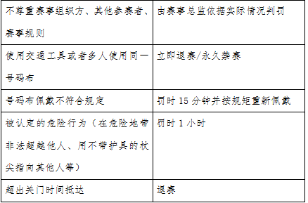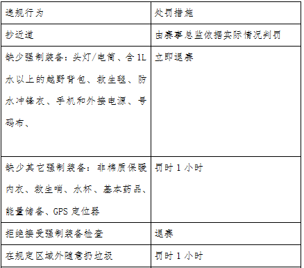 赛事管理人员分布于赛道各处,他们当中负责管理补给和安全保障站点的人员有权行使赛事管理规则,并可以针对违反规则的行为立即进行处罚,处罚依据如下: