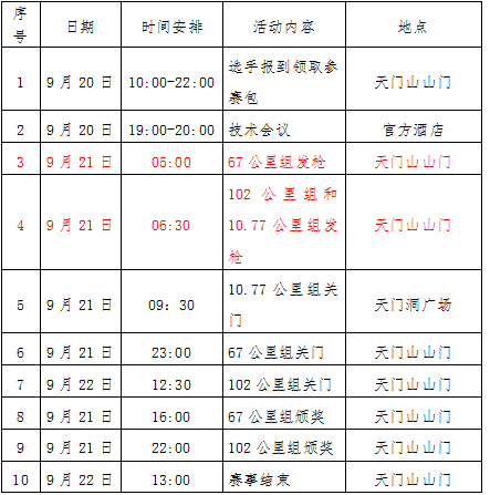 2、发枪:组委会统一安排车辆从市区指定位置(官方酒店)摆渡运动员到天门山山门起点。第一趟为9月21日凌晨4点15,最后一趟为9月21日6点,坐满发车,请各组别参赛者合理安排好时间,以免错过比赛发枪。