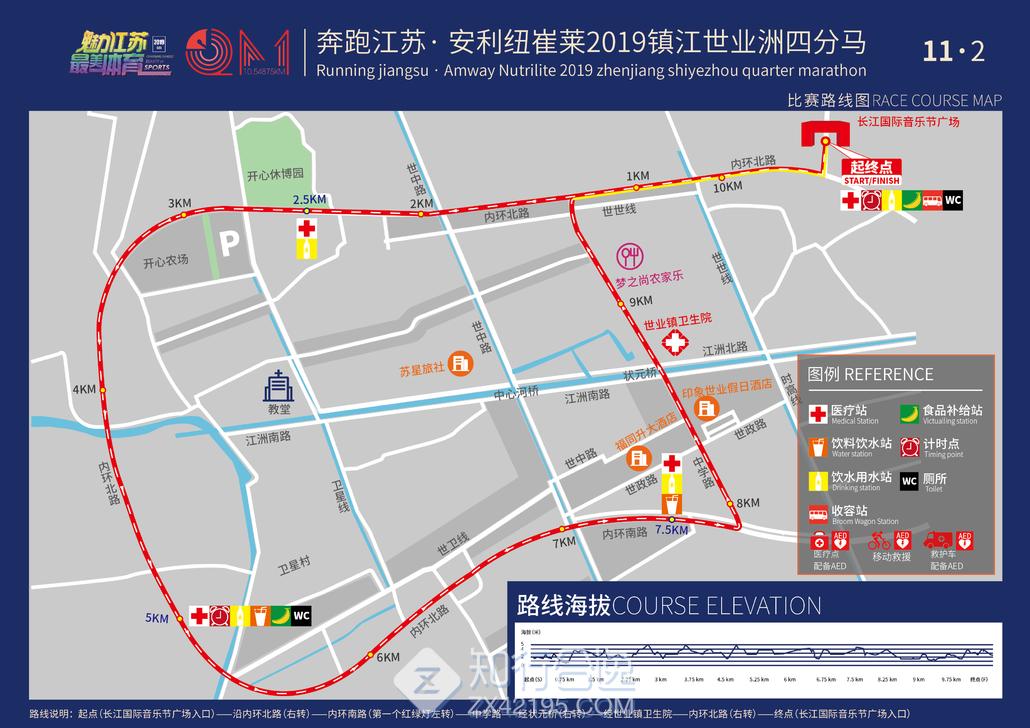 长江国际音乐节广场入口(起点)—沿内环北路(右转)—内环南路(第一个红绿灯左转)—中学路—经状元桥(右转)—经世业镇卫生院—内环北路(右转)—长江国际音乐节广场入口(终点);