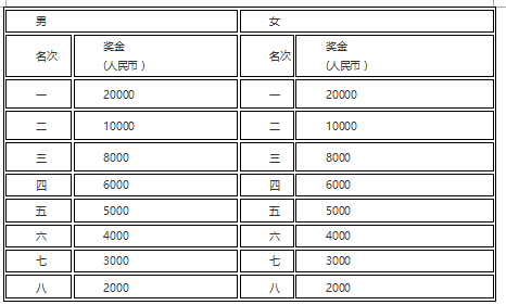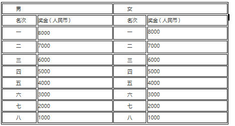 名次奖:男、女第1至第8名选手分别获得奖金(见下表)