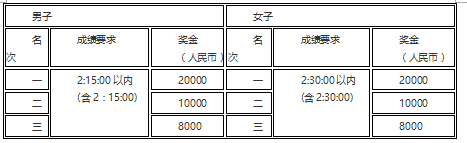 中国籍选手达到如下成绩要求并获得中国籍选手男子和女子前三名,将分别获得奖金,如中国籍选手获得前八名,比赛奖金不累加,依此规定按最高金额发放。如达不到,奖金金额减半。(特别奖奖项设置见下表)