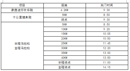 为了保证参赛选手比赛安全、顺利,比赛期间设关门时间,限时对社会交通封闭。关门时间后,相应路段恢复社会交通。在规定的关门时间内,未跑完对应距离的参赛选手须立即停止比赛,退出赛道,以免发生危险。退出比赛的选手可乘坐组委会提供的收容车到达终点处。