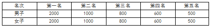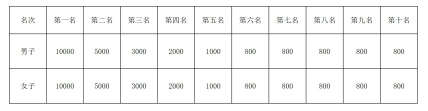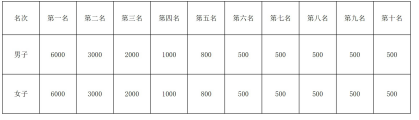 名次奖励:男、女奖励前10名运动员,并分别获得奖金(单位:元,税前),男、女前三名颁发奖杯。