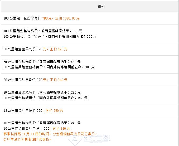 限时优惠价:赛事按距离11月21日的时间,分金银铜丝早鸟价及正常价,金丝早鸟价为最低价。