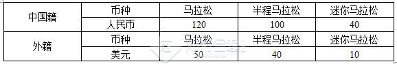 2.外国籍报名者:马拉松每人50美元;半程马拉松每人40美元;迷你马拉松每人10美元。