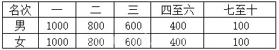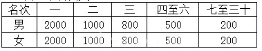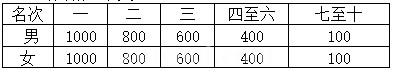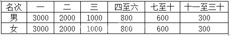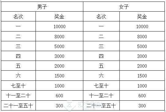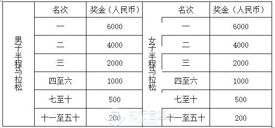 男子半程马拉松 名次 奖金(人民币) 女子半程马拉松 名次 奖金(人民币)
