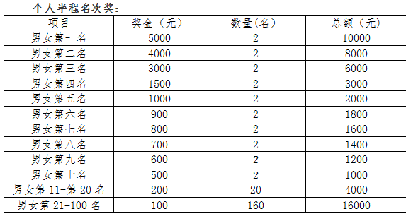 注:根据赛会计时成绩录取个人项目男、女第1名至第100名参赛选手,并分别获得奖金(单位:人民币元),个人项目前三名颁发奖杯。