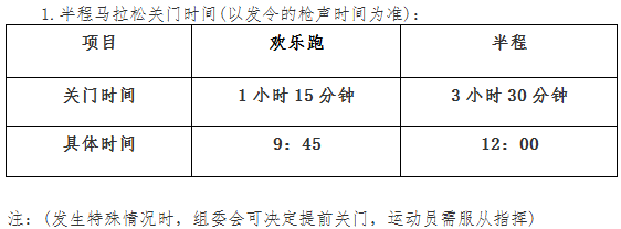 (四) 关门点和时间限制为了保证参赛运动员比赛安全、顺利,比赛期间比赛路线各段设关门时间,限时进行交通封闭。关门时间到后,相应路段恢复正常交通。在规定的关门时间内,未跑完对应距离的参赛者应立即停止比赛,退出赛道,以免发生危险。退出的参赛者可乘坐组委会提供的收容车到相应项目的终点处。