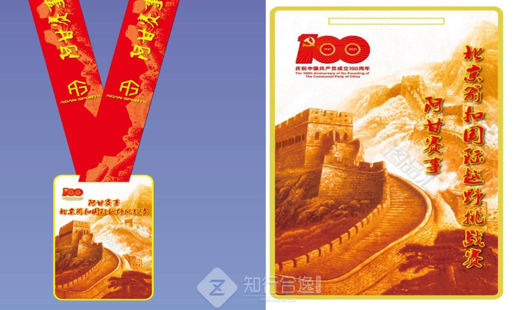 (本奖牌采用浮雕和金漆雕琢而成,主图案中的九眼敌楼是长城中的代表,放眼望去,箭扣长城气势恢宏,令人震撼)