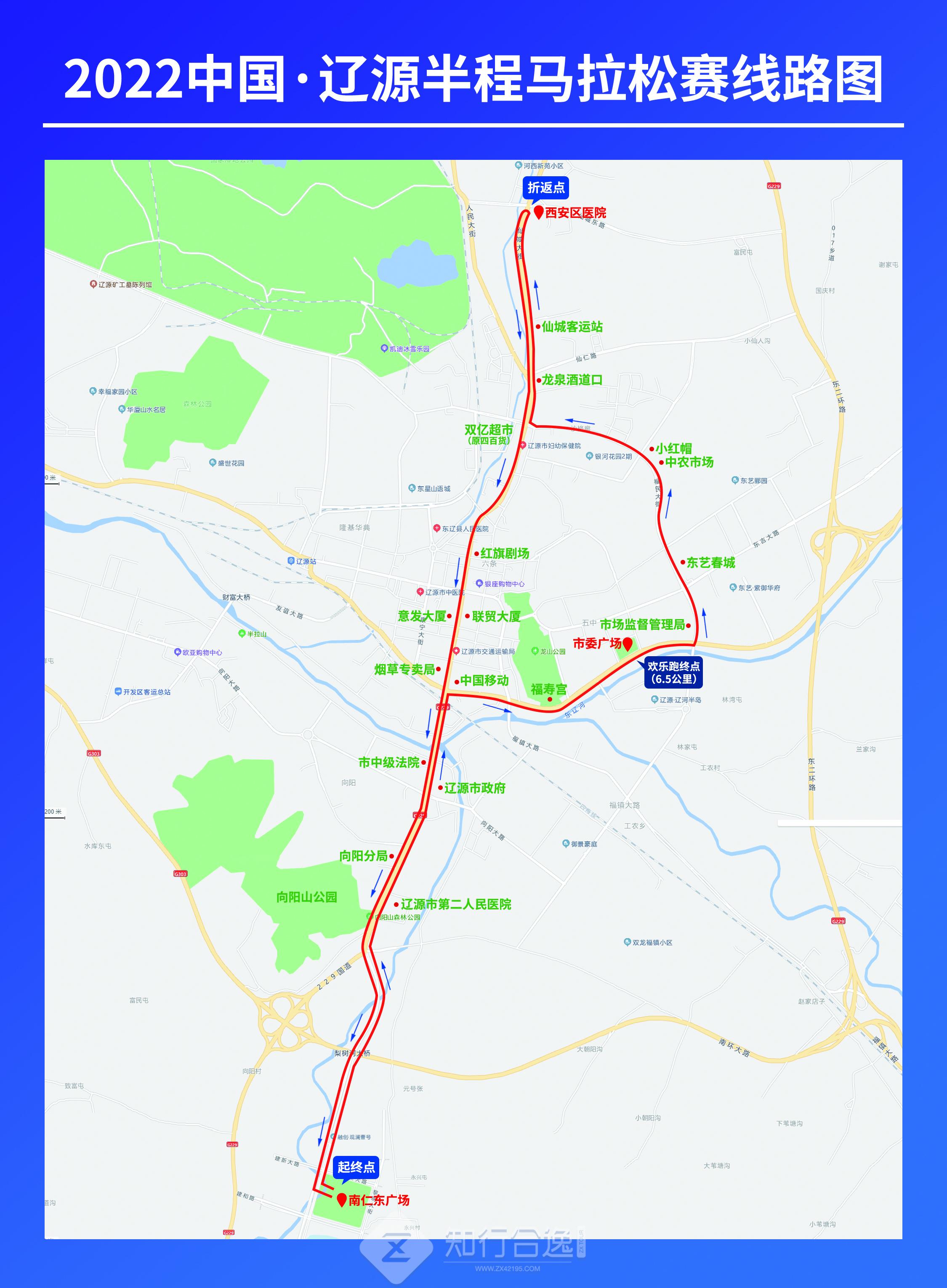 起点:南仁东广场→融创集团→向阳家居建材商城→辽源市第二人民医院→辽源市政府→南门加油站→中国移动→福寿宫→市委广场(欢乐跑终点-6.5公里)→市场监督管理局→东艺春城→中农市场→小红帽→市文旅局(二战高级战俘营)→龙泉酒道口→仙城客运站→西安区医院(折返点)→双亿超市(原四百货)一御峰广场→意发大厦→烟草专卖局→市中级人民法院→向阳分局→向阳山公园→融创集团→南仁东广场(终点)