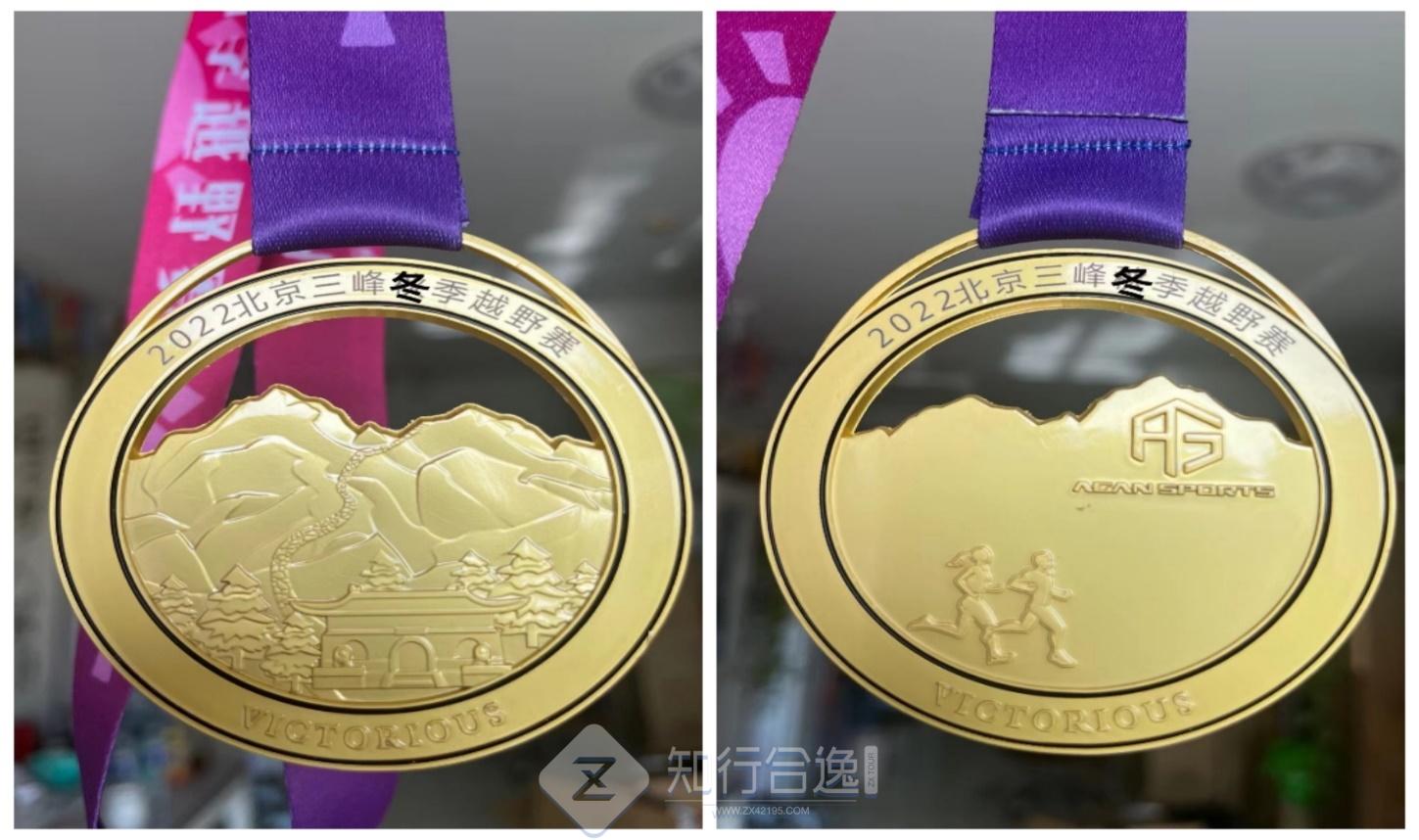 完赛奖牌图中正面是第一个建筑是大觉寺山门,门前有几颗苍劲的古柏,紧接着是通往风口的妙峰古道,妙峰古道铺在鹫峰上,紧接着是阳台山,构成了一副美丽的三峰画卷图,(团体组刻团体名字和队员姓名)奖牌图案: