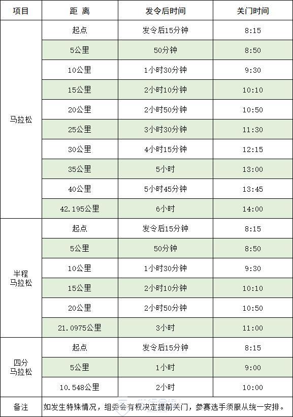 1.为保证选手比赛安全和城市道路交通秩序,各公里点关门后,比赛计时感应地毯即停止工作,未跑完对应的距离者视为自动退出比赛,应立即停止比赛,等候乘坐组委会收容车抵达终点。发令后 15 分钟后起点关闭,选手不得进入赛道。