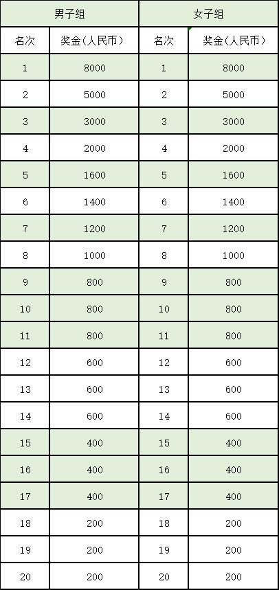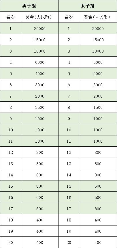 本次比赛马拉松组录取男子、女子组各前20名。其中1-3名按照枪声成绩录取,4-20名按照净计时成绩录取。
