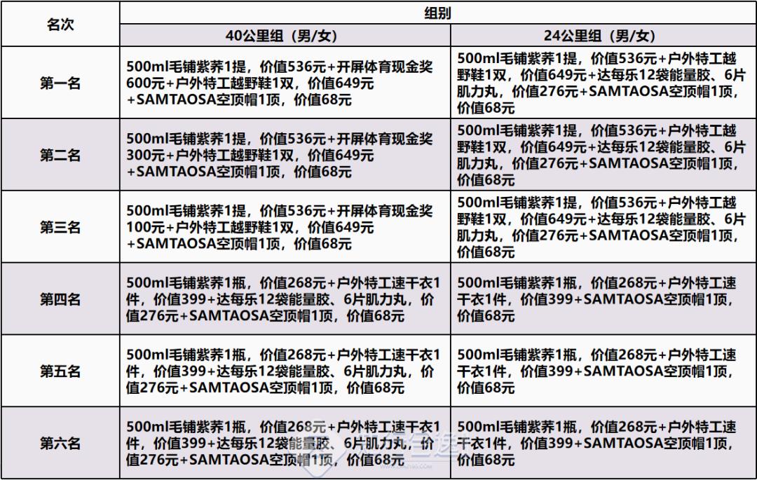 男/女子组各取前六名,根据计时芯片最终统计的成绩进行名次的判定并发放相对应的奖杯及奖品,40公里组前三名还有开屏体育提供的现金奖励:
