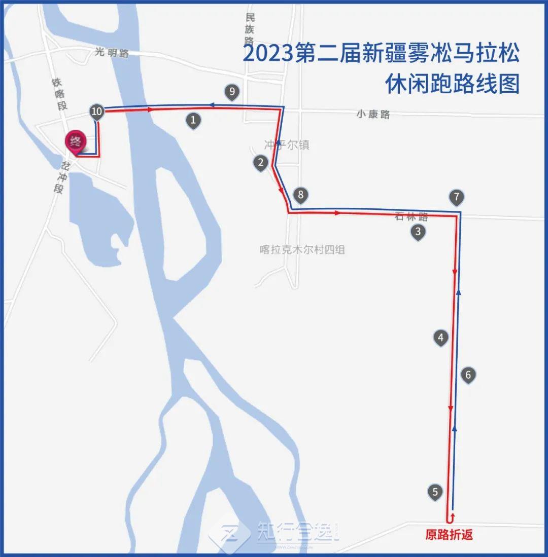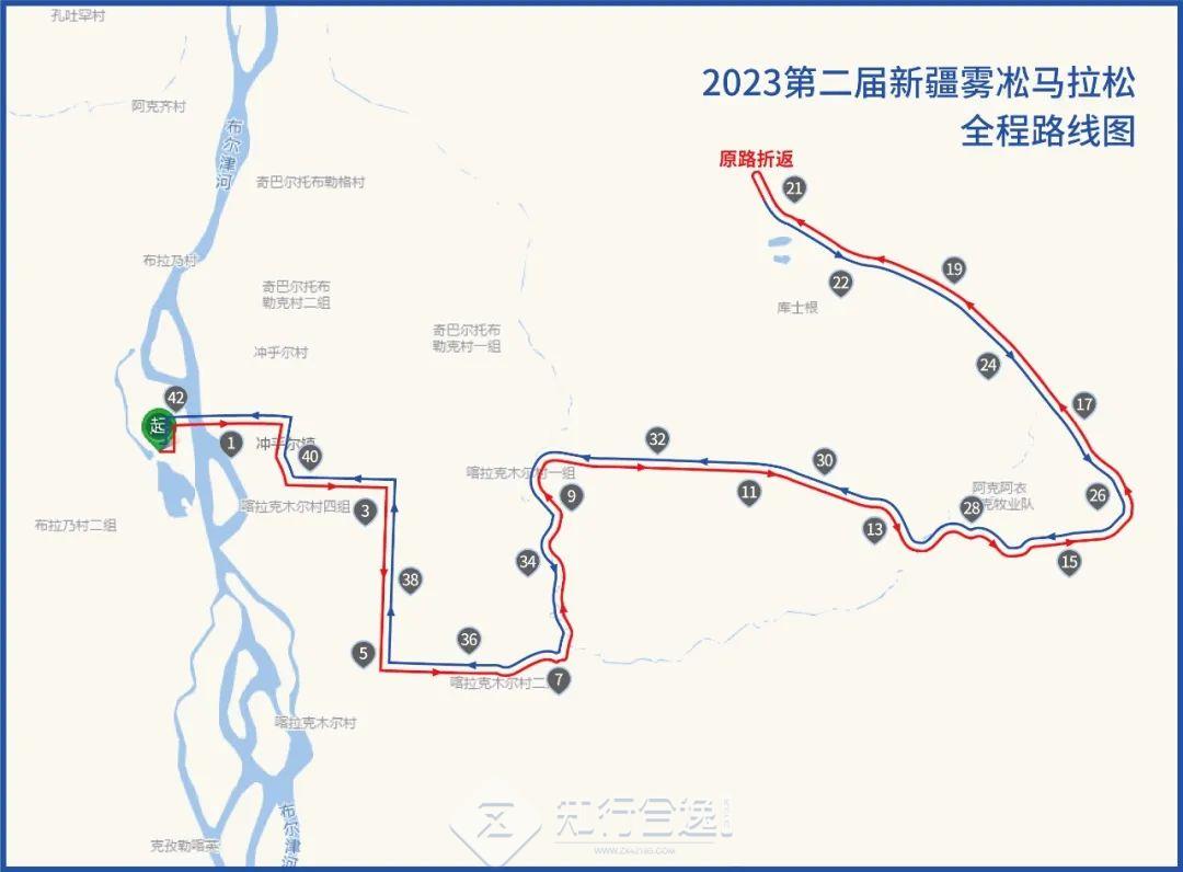全程马拉松:冲乎尔大巴扎(起点)--冲乎尔大桥--冲乎尔镇--小康路--雾凇大道--喀拉克木尔村--阿克阿依日克--阿哈勒--库须根(折返)--冲乎尔大巴扎(终点)