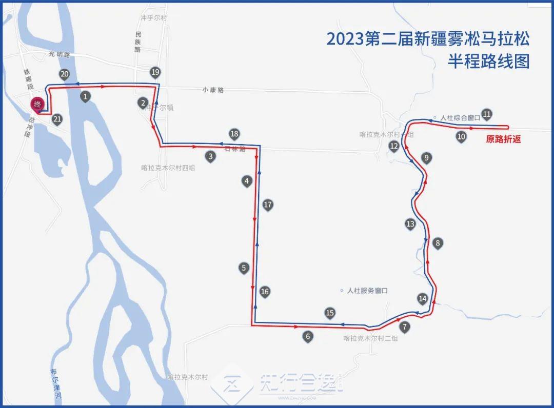 半程马拉松:冲乎尔大巴扎(起点)--冲乎尔大桥--冲乎尔镇--小康路--雾凇大道--喀拉克木尔村--阿克阿依日克(折返)--冲乎尔大巴扎(终点)