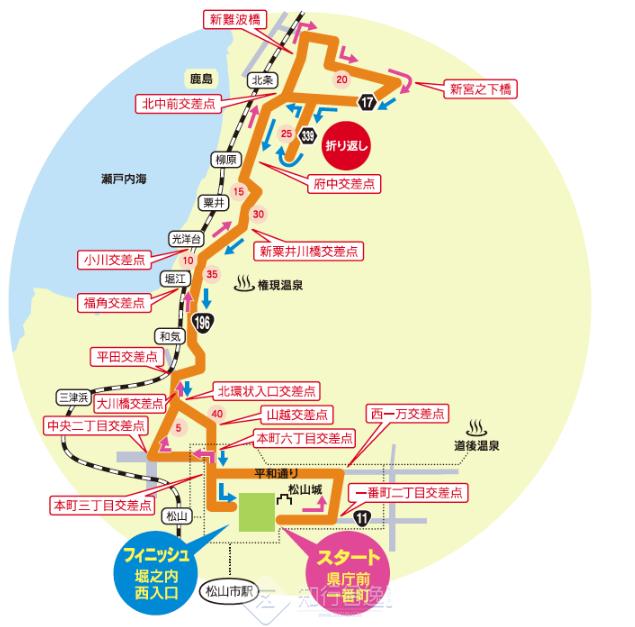 第61届爱媛马拉松是从爱媛县厅前开始,以堀之内的城山公园为终点的“爱媛马拉松松山长跑路”(42.195km,日本田径联盟公认的世界阿斯莱蒂克斯(WA)/AIMS公认)