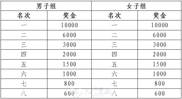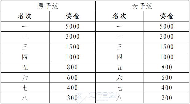 男、女分别录取前8名(以枪声计时成绩排名),分别获得奖金,见下表(单位:人民币/元)。