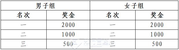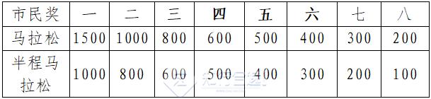 2.本次比赛组委会特设立新余籍市民奖,男、女分别录取前8名(按净计时成绩进行排名),分别获得奖金,见下表(单位:人民币/元)。