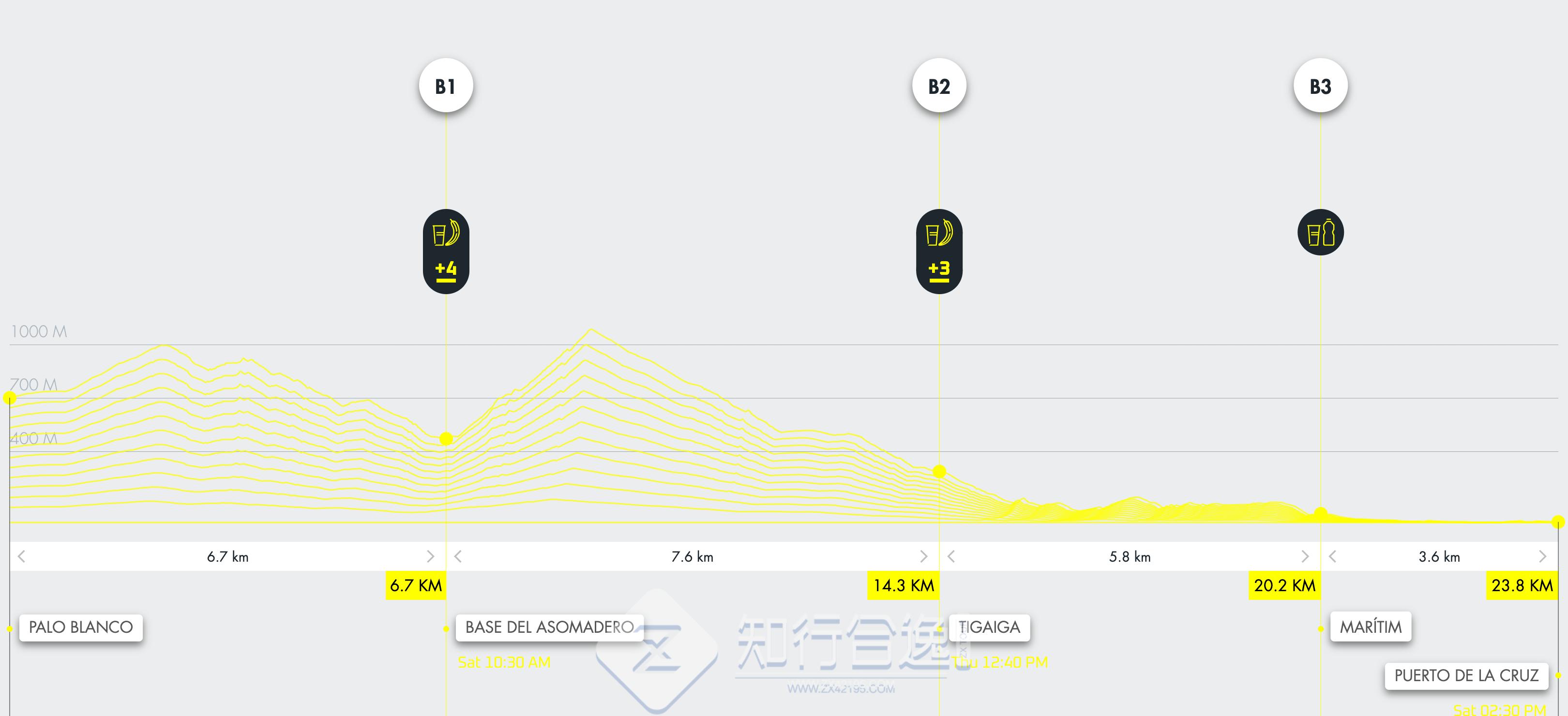 20公里: 总长度24公里,适合那些想在特内里费岛山脉和大西洋的绿色地带体验神奇冒险的人。路线从特内里费岛北部的洛斯·雷雷霍斯市开始,穿过一条充满惊人景色的沿海小路 El Asomadero 和 Rambla de Castro,跑过一个令人惊叹的自然环境。这个赛程对山地赛爱好者有着特殊的吸引力,每年都会很快售罄。