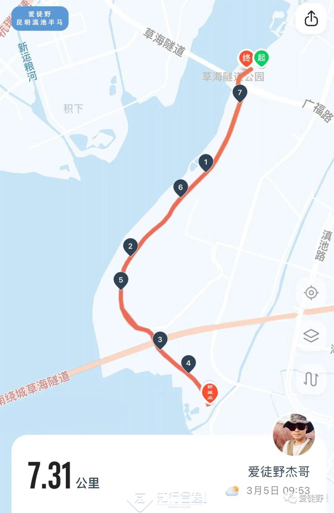 7公里组: 一个折返来回7km, 共折返1圈